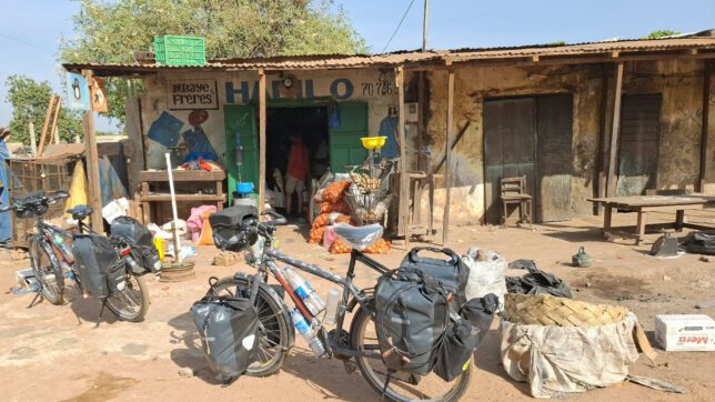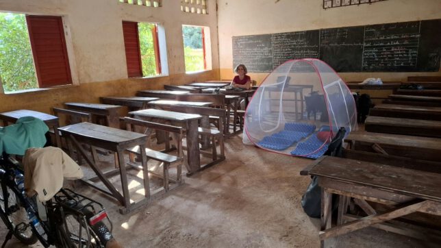 Wir setzten uns auf ein Bänkchen unter eine alte Plastikplane vor ein kleines Tischchen, auf dem ein paar Waren angeboten wurden, und tranken irgendein Süßgetränk aus dem „Laden“. Der Ladenbesitzer und die vorbeilaufenden Dorfbewohner waren mal wieder sehr an uns interessiert. Sanft flochten wir unsere Erschöpfung in das Gespräch ein und fragten dann, nach einer Zeit der Unterhaltung, ob man hier vielleicht irgendwo für die Nacht ausruhen könne. Vielleicht wäre ja in der Schule ein Plätzchen für uns? Die Schule ist oft das beste Gebäude in den Dörfern, meist etwas abgelegen, oft mit Brunnen oder Wasserhahn und immer mit Toiletten – ideale Bedingungen für uns. Es war Samstag, und wir dachten, dass das Schulgebäude ein ruhiges Plätzchen für uns sein könnte. Das war unsere Vorstellung der Dinge. Wir erlebten aber natürlich schon sehr oft, dass wir absurde Vorstellungen von der Wirklichkeit hier haben.