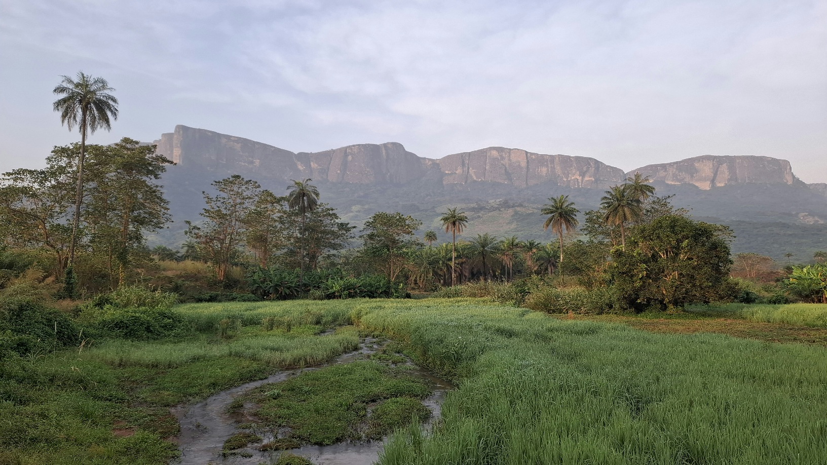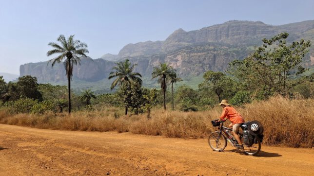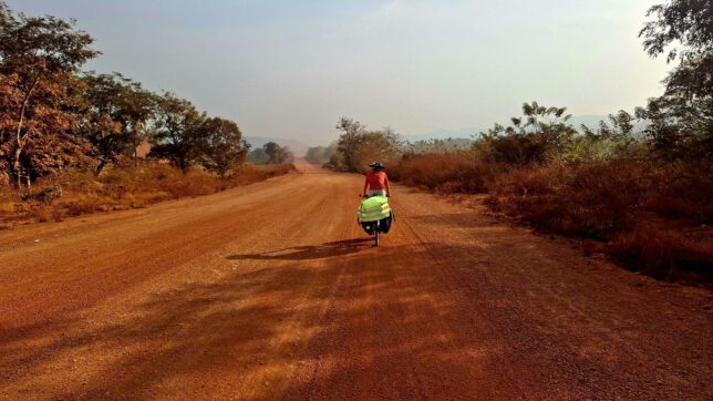 Das nächste tiefe Schlagloch der Schotterpiste holt mich dann wieder aus diesen Gedanken, und ich steuere das schwere Rad vorbei an den sandigen Stellen am Rand des hohen Savannengrases. Rechts neben uns befeuert das rote Morgenlicht die hohen Felsabstürze des Fouta Djalon. Imposant liegen die kleinen Felder der Bauern hier im Busch, und ab und zu überqueren wir einen kleinen Bach, an dem Frauen die Wäsche waschen.