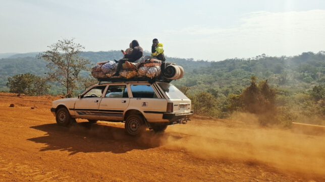 Das Gras ist so dicht, dass wir nicht sehen können, was sich zwei Meter neben der Straße alles so am Boden bewegt. Es ist still, kein Straßenverkehr, keine Menschen, und wir wundern uns, denn dies ist die Hauptstraße, die Senegal mit Guinea verbindet. Alle fünf bis zehn Minuten kommt mal ein Moped vorbei, teilweise reisen so ganze Familien: Mutter, Vater und zwei Kinder. Wir zählten auch schon bis zu fünf Personen auf diesen kleinen Motorrädern, die hier das Hauptverkehrsmittel sind. Hier sind die Menschen so arm, dass es praktisch keine Privat-Pkw gibt. Gelegentlich fährt ein sehr alter Renault 505 vorbei. Ein Überlandsammeltaxi. Auf dem Dachgepäckträger eine Beladung, so hoch gepackt, dass das Auto höher als lang erscheint. Obendrauf sitzen dann noch zwei bis drei Menschen – eine haarsträubende Anordnung, die aufgrund des hohen Schwerpunkts schon in leichten Kurven bedenklich schwankt.