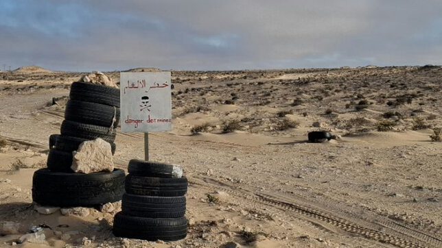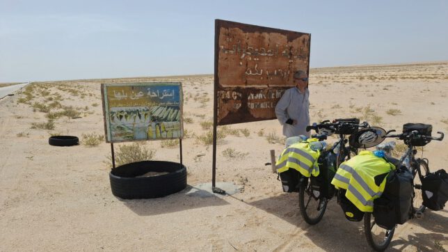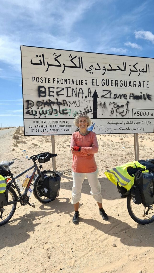 All das wussten wir am Vorabend unserer Einreise. Da empfanden wir es auch nur konsequent, dass der vor uns liegende Grenzübergang den Ruf hatte, einer der schwierigsten ganz Afrikas zu sein. Zwischen den beiden Ländern Marokko und Mauretanien liegt eines der weltweit am stärksten verminten Gebiete. Dieser Grenzwall durchzieht die ganze Westsahara. Ein Sandwall von 1500 Kilometern Länge. Neben der Chinesischen Mauer das längste menschlich erschaffene Gebilde. Als wir uns morgens mit den Rädern aufmachen ist uns mulmig. Neben der Straße stehen immer wieder Warntafeln, die vor den Landminen warnen. Als wir den Ausreisestempel von Marokko in unserem Pass haben, fahren wir durch das Niemandsland. Die asphaltierte Straße endet hier und geht über in eine ruckelige Sandpiste. Für den motorisierten Verkehr dauern die Grenzformalitäten auf der mauretanischen Seite mehrere Stunden, so dass wir jetzt, kurz nach 9 Uhr vormittags, noch ganz allein hier unterwegs sind. Die Piste ist so schlecht, dass wir kaum mehr als Schrittgeschwindigkeit fahren können. Langsam tauchen am Horizont die Grenzgebäude Mauretaniens auf.