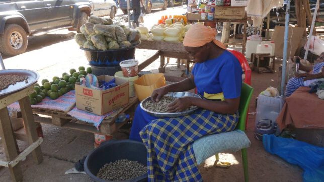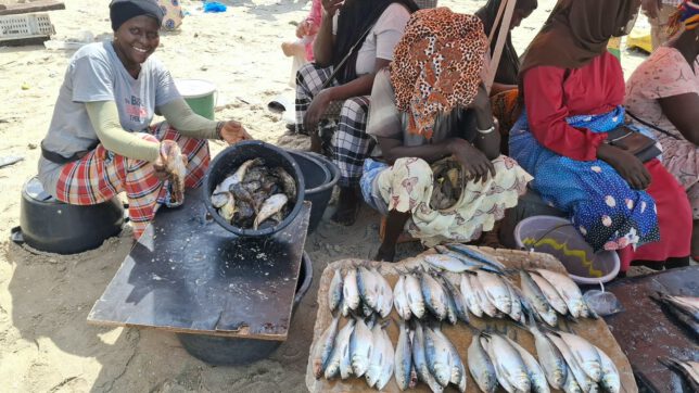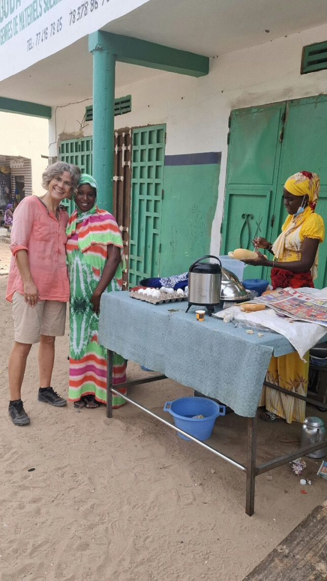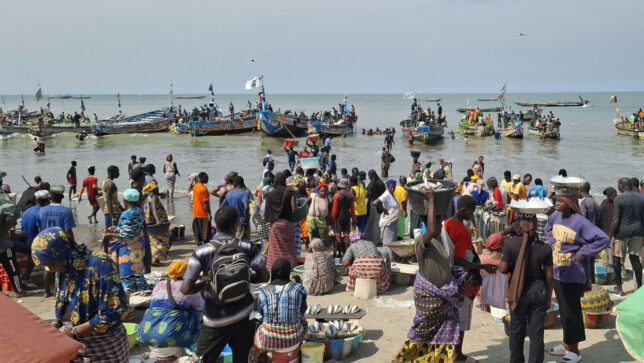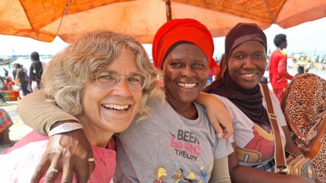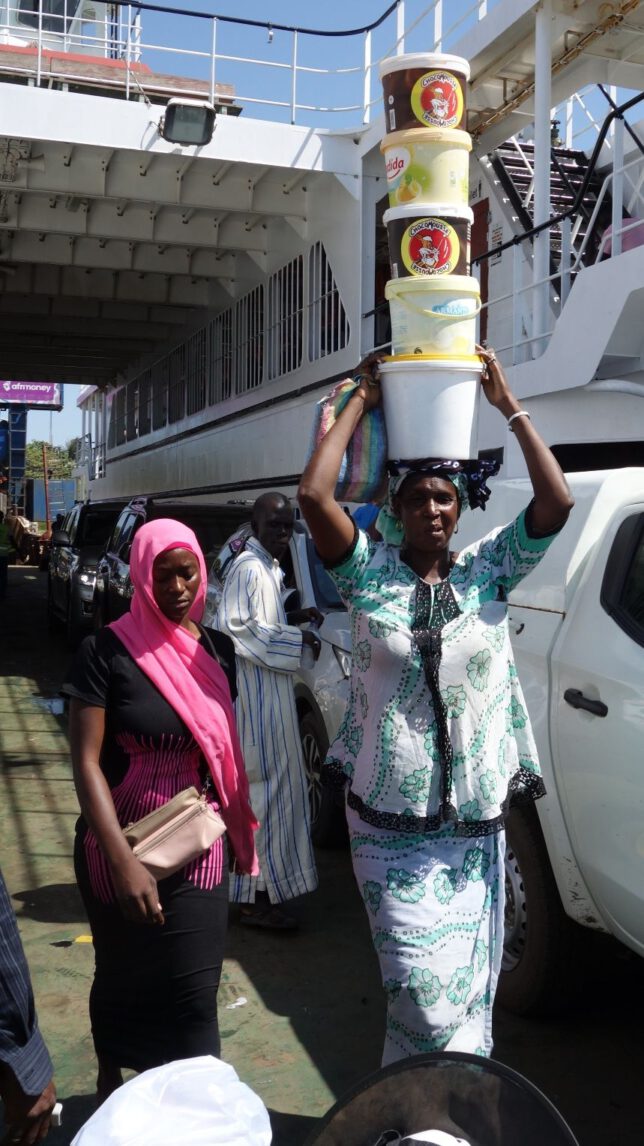 Am nächsten Tag holen wir die Ersatzteile bei einer gambischen Familie ab, die unsere Freundin Hanna dort vor einem Dreivierteljahr deponiert hat. Hanna hat dort ein Hilfsprojekt. Danach gehen wir an den Strand. Dort ist alles voll mit Menschen. Die großen Pirogen sind in der Dünung vor dem Strand vor Anker. Hin und her waten kräftige junge Männer mit großen Plastikkisten auf den Köpfen. Sie tragen den Fang zum Ufer. Zurück am Strand werden die Kisten voll Fisch versteigert und Marktfrauen tragen sie an ihre Stände. Ein gigantisches Chaos. Wir sind fasziniert und stehen staunden in der Menge. Da zupft Imke eine sitzende Frau zu sich herab. Wir sollen ein bisschen in den Schatten ihres alten Sonnenschirms kommen. Alle rutschen zusammen. Jetzt sitzen wir auf umgedrehten Mayonnaiseeimern und unterhalten uns.