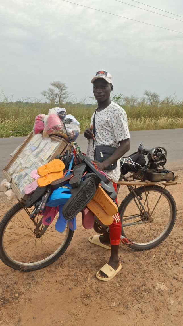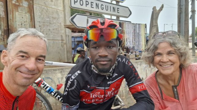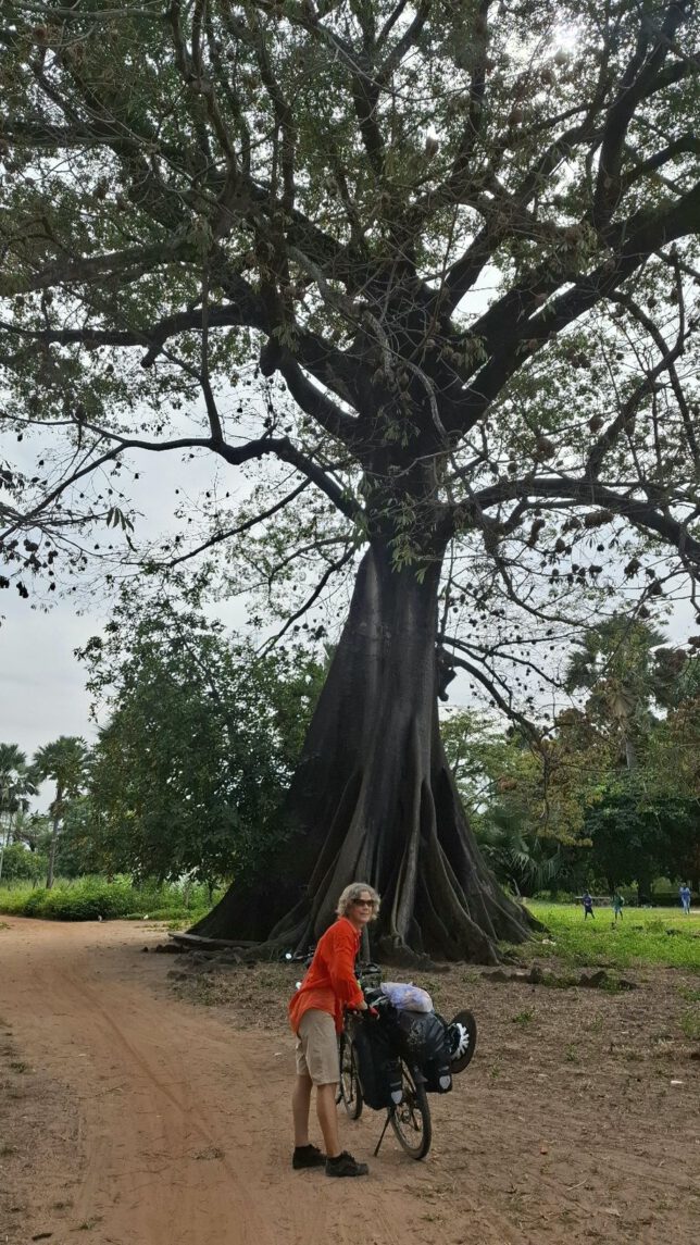 Am nächsten Morgen fahren wir von Toubakouta los. Das Saloum-Delta haben wir mit der Piroge durchquert. Ab hier geht die Nationalstraße nach Süden. Sie endet am Gambiafluss. Von dort geht die Fähre nach Banjul in ein neues Land: Gambia. „Bisher sind wir ja nur radgefahren, jetzt kommt nochmal was obendrauf.“ Imke hat Recht. Das, was obendrauf kommt, ist Afrika und was der jeweilige Tag von uns fordert. Und das kann ganz schön viel sein. Heute sieht das so aus: Eine Ausreise (Senegal) mit allen dazugehörigen bürokratischen Formalitäten an einem überfüllten Grenzübergang. Eine Einreise (Gambia) mit denselben Behördenkontakten, nur in einem neuen Land auf einer anderen Sprache. Nebenbei eine Simkarte im Menschengedränge gekauft (Straßenverkäufer). Danach in einer Nebengasse (unter den Augen der Grenzpolizei war es dem Wechsler offensichtlich nicht so wohl) 60.000 senegalesische Francs in gambische Dalasi getauscht. Einmal Fähre gefahren im Gedränge neben einem Sarg, auf den ich mich unwissend erst draufgesetzt habe. Simkarte aufladen lassen mit 4 Gigabite von einer jungen Frau, die mit Imke ihr ganzes Leben bespricht. Danach 20 Kilometer durch eine Großstadt (Serekunda/Banjul) gefahren mit dem typischen afrikanischen Chaosverkehr – ein mehrstündiges Hupkonzert, das uns noch abends beim Einschlafen die Ohren klingeln lässt. Zuletzt im größten Fischerdorf Gambias mitten während des Fischmarkts eine Unterkunft gesucht. Dann nur noch: Wäschewaschen, zum Trocknen aufhängen, Duschen, Essen gehen oder Einkaufen, nächsten Tag überdenken und sich vor dem Einschlafen fragen: „Wo sind wir heute früh nochmal losgefahren?“