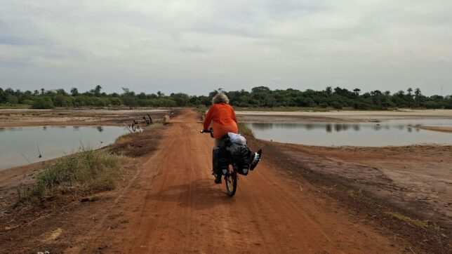 Wir leiden an der Luftfeuchtigkeit. Fünf Minuten nach sieben Uhr morgens sind wir wie von einem Eimer Wasser übergossen. Das Hemd klebt uns am Oberkörper und aus den kurzen Hosen tropft das Wasser. Um sieben Uhr sind wir losgefahren. Bis zum Ende des Radtages werden wir in diesen nassen Kleidern im Sattel sitzen. Ab und zu wringen wir die Radhandschuhe aus. Die Finger und die Hände sind nach einiger Zeit schon so von der Feuchtigkeit schrumpelig, als hätte man uns in der Badewanne liegen lassen und vergessen. Die mächtige Sonne zieht aus den tausenden Quadratkilometer Mangroven das Wasser und wirft es jede Minute uns als Luftfeuchtigkeit entgegen. Wir wissen nicht, wie es uns gelingt, am Ende des Tages nicht so wasserlos ausgedörrt wie Rosinen auszusehen. Jeden Tag trinken wir zusammen mehr als 10 Liter. In Mauretanien dachten wir, dass es im Senegal mit den Temperaturen besser werde. Jetzt wissen wir: Es wird anders.
