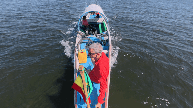 Im Bug der Piroge liegen unsere beiden staubigen Räder und unsere grauen Satteltaschen. 50 Liter Sprit brauchen wir für die Fahrt. Zwei große Kanister. Anderes Gepäck haben die beiden nicht an Bord. Der Außenborder röhrt in hoher Drehzahl im Heck. Das Boot gleitet wunderbar schnell über die glatte Wasserfläche. Die Pirogen, die wir hier an der ganzen Küste sehen, sind elegant gebaut. Für die Hochsee sind sie nicht gemacht. Die Nordatlantik-Fluchtroute geht über 1000 Kilometer durch gefährliche Hochseegewässer mit starken Strömungen, gefährlichen Winden und hohem Seegang. Mehrere Tage sind die Flüchtlingsboote so unterwegs. Wir können uns nicht vorstellen, wie sich das für Menschen anfühlen muss, die ihr ganzes Leben noch nie auf einem Boot waren.