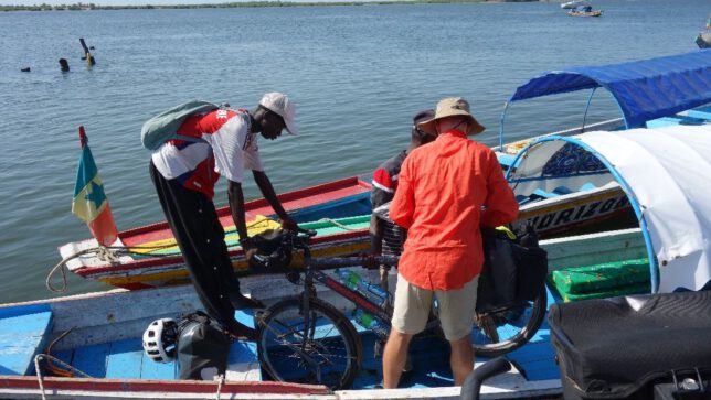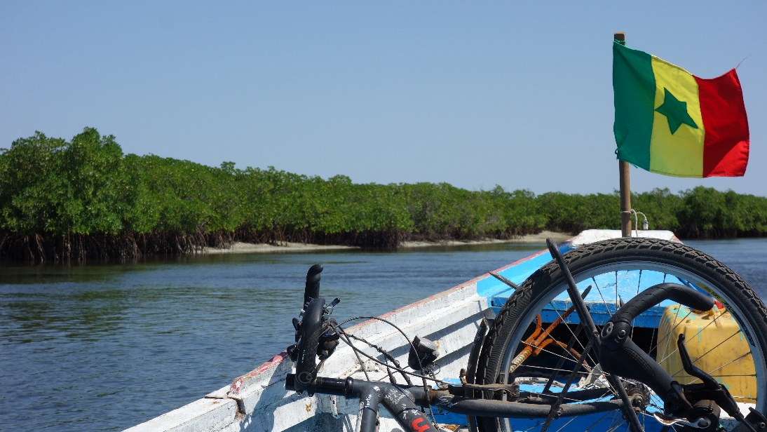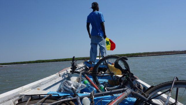 Ursprünglich wollten wir in einem riesigen Bogen diese Flussdeltas umfahren. Dann kam uns die Idee, das Boot zu nehmen. In Dangane verladen wir die Räder auf eine kleine Piroge. Wir haben einen Kapitän davon überzeugt uns quer durch das Saloum-Delta zu fahren. Eine Bootsfahrt von vier Stunden – Vollgas mit einem starken Außenborder. Die schmale, bunt bemalte Piroge, die wir gewählt haben, ist schnell. Dennoch ist die Fahrt so lang, dass es keine Sammel-Wassertaxis dafür gibt. Wenn wir den öffentlichen Transport gewählt hätten, wären wir mehrer Tage unterwegs gewesen und hätten auf den kleinen Inseln übernachten müssen. Ob wir dann von dort weitergekommen wären, konnte uns mit Sicherheit aber niemand sagen. Also holten wir ein paar Scheine senegalesische Francs aus der Tasche und es fand sich sehr schnell eine Crew. Der Außenborderjunge war sehr wortkarg. Aber der 21-jährige Kapitän freute sich, sein Wissen über das Delta weiterzugeben. Er hat alles von seinem Großvater. Sein Großvater wusste alles, berichtet er stolz.