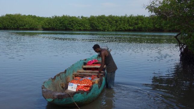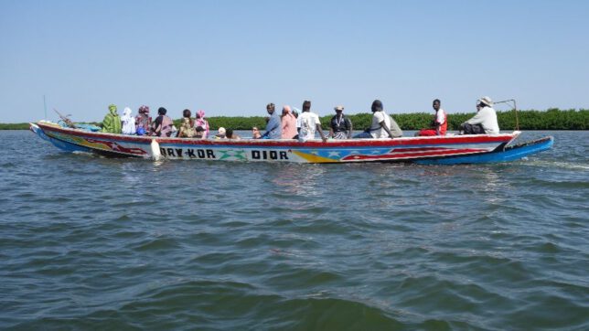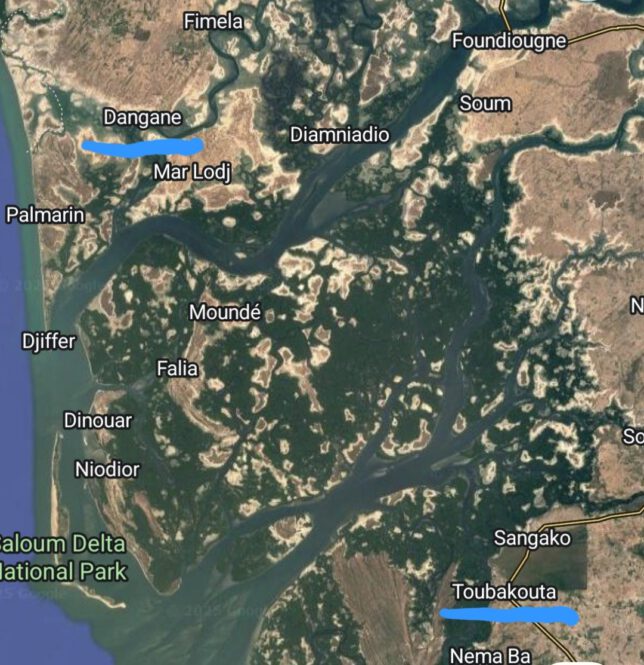 Südlich von Dakar geht die Trockensavanne in die Mangroven über. Viele tausend Quadratkilometer verzweigte Stromarme der Flüsse Saloum, Gambia und Casamance. Eine gigantische Fläche von salzwassergefluteten unbegehbaren Sumpfgebieten, Inseln, Meerarmen. 200 Kilometer ins Landesinnere reichen die Meeresgezeiten-Tidenhube in den Casamance-Fluss. Der Atlantik schiebt seine Gezeiten bis tief ins Landesinnere und macht aus einer gigantischen Fläche Inselland. Im Saloum-Delta leben 26.000 Menschen auf kleinen und kleinsten Inseln, teilweise nur ein paar hundert Meter im Durchmesser groß. Dort ist das Boot, die Piroge – ein aus Holz gefertigtes schmales Fischerboot mit Außenborder, das einzige Fortbewegungsmittel. Wir sehen aber auch Fischer auf Einbäumen, die das Boot mit langen Stangen durch das flache Wasser stochern.