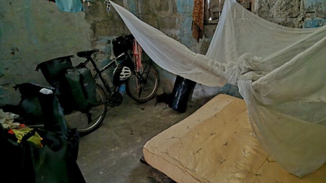 „Nehmt eure Räder mit rein, ihr könnt sie auch in der Zelle parken.“ Gemischte Gefühle durchfluteten mich. Hatte er gerade „Zelle“ gesagt? Wir waren immer in Sorge, dass unsere Räder eine sichere Übernachtung haben. Eine Zelle für die Räder ist gut. Ich war zufrieden. Aber hatte er gerade „AUCH in der Zelle“ gesagt? Übernachten wir auch in der Zelle? Oh ja, wir übernachteten in der Zelle. Und was für eine Zelle es war! Als wir die Räder durch die schmale Tür in die Station schoben und sich unsere Augen an die schummrige Düsternis dort gewöhnten, sahen wir, dass die hübsch bemalte Fassade von innen ein mit Müll vollgestellter Rohbau war. Rechts neben dem Eingang waren ein einfacher Holztisch mit zwei Stühlen die einzigen Möbelstücke im Haus. Dort saßen mit Handschellen aneinandergekettet zwei etwa zehnjährige Jungen, deprimiert die Blicke auf die Holzplatte des Tischs niedergeschlagen. Wir erschraken und taten so als sähen wir sie nicht. Im hinteren Bereich gab es zwei kleine Räume. In einen davon, die Zelle, parkten wir jetzt die Räder. Das Fenster war mit dicken Brettern vernagelt, so dass wir erst gar nichts in der Dunkelheit erkennen konnten. Dann sahen wir eine große blaue Tonne in der Ecke voll mit stinkendem Wasser abgedeckt mit Brettern. Eine aus alten Reissäcken zusammengenähte Strohmatratze lag auf dem Boden, nicht ganz Kingsize Format. Darüber ein zerfetztes Moskitonetz. In der Ecke lagen Handschellen und ein altes Paar hochhackiger Frauenschuhe. Feuchte Hitze füllte den Raum.
