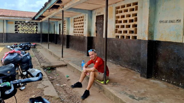 Ich wusste ganz genau, was sich in der Stille hinter mir an Kampf ereignet. Wir sind radfahrend so aufeinander abgestimmt, dass ich mich nicht umdrehen musste, um zu wissen wie groß das Leiden war. Auch darin haben wir eine gewisse Gewöhnung, es ist ein Vertrautsein mit dem Leiden. Bei Kilometer 70 war der Kampf zu Ende. Es ging nicht mehr. Wir standen vor einem unfertigen Bau. Eine Art noch nicht fertiggebauter und schon verfallener Karaokebar. Sie war verlassen. Ein einsamer Arbeiter werkelte daneben in einer Baugrube. Ich fragte ihn, ob man hier übernachten kann. In Afrika ist nichts unmöglich. In einer halben Stunde war der „Chef“ da. Ein schmieriger Typ, der 160 Leones verlangte und uns ein Hinterzimmer ohne Tür zeigte. Ich legte für Imke die Isomatten auf den Boden und baute unser Moskitonetz auf. Sie hatte 39 Grad Fieber und es stieg weiter. Ihr war furchtbar schlecht und ihre Stimme ganz schwach. Bald schon war niemand mehr da außer uns und die Dämmerung brach an. Das Dorf war noch ein Stück entfernt und außer den Grillen ringsumher war alles still. Auf der Straße war kein Verkehr mehr. Jetzt kam die Dunkelheit.
