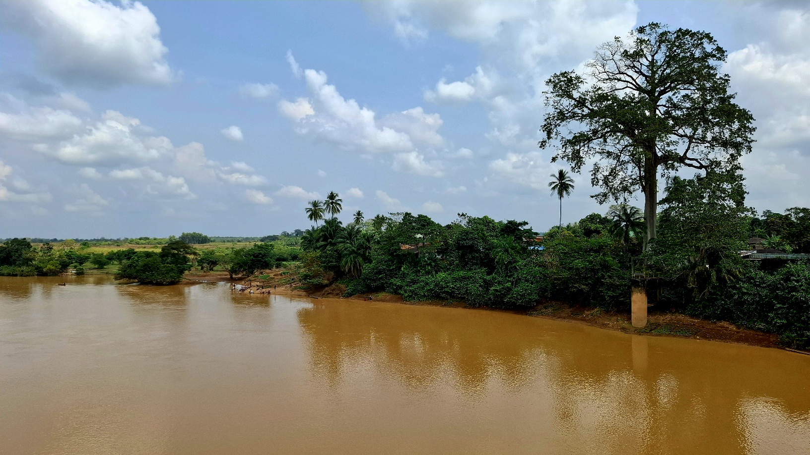 So wussten wir auch heute nicht, was uns erwarten würde. Wir fuhren durch eine langweilige Landschaft, die hauptsächlich aus dschungelartigem Gestrüpp bestand. Alles verschwand hinter diesem drei Meter hohen Vorhang aus unordentlichem Grün. Selten sahen wir Hügel am Horizont. Kaum ging unser Blick weiter als ein paar dutzend Meter seitlich der Straße. Wir schwitzten und waren in Gedanken. Die Eindrücke, die Freetown vor allem bei Imke hinterließ, warfen düstere Schatten. Die vielen armen Dörfer, die wir jetzt passierten, waren nur kurze Abwechslungen und meist eher mühsam. Auch wenn das Radfahren mal zäher ging, zwangen wir uns den begeisterten Rufen und Grüßen der Menschen am Straßenrand höflich zu antworten. Heute merkten wir, dass das auf Dauer auch anstrengend war. Heute wäre uns eine menschenleere Wüste lieber gewesen.