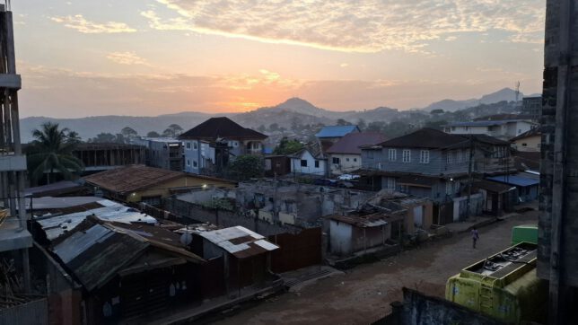 Die Sonne geht über Freetown auf. Morgens und abends brennen die Müllfeuer und hüllen die Stadt zusätzlich in Smog ein. Das färbt den Sonnenaufgang romantisch rot.