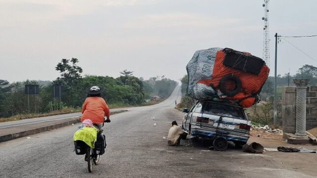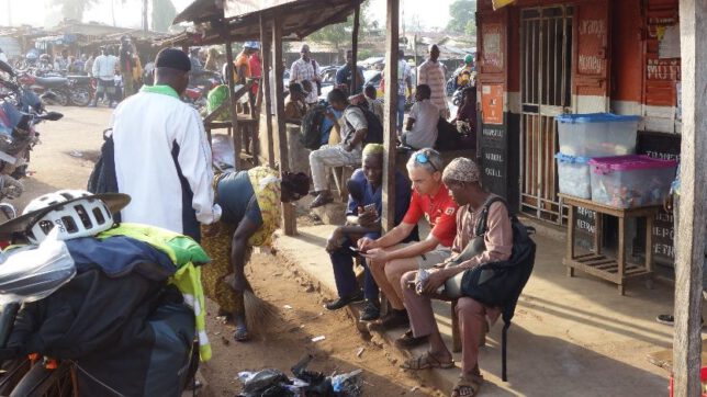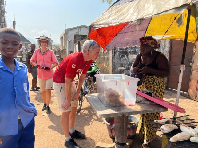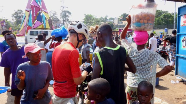 So wurde aus unserem einwöchig geplanten Aufenthalt in Freetown schließlich zwei Wochen. Imke war wieder gesund und fit wie zuvor und in unseren Pässen hatten wir jetzt drei neue Visastempel. Immer noch trugen wir viereinhalb Geldziegel in unseren Satteltaschen mit uns herum. Eigentlich hätten wir also fröhlich wieder weiterfahren können. Ich war allerdings traurig. Wirklich traurig. Wir schoben die Räder auf die Straße und wollten die paar Kilometer raus aufs Land zum Farmhaus fahren. Kai begleitete uns mit seinem Gravelbike. Ich war traurig, denn ich hatte Bekanntschaften geschlossen. Eine Woche lang machte ich die Besorgungen und Imke blieb aufgrund ihres Fiebers in der Wohnung. Jeden Tag ging ich mehrmals los und lief die Straße runter, ging zum Markt, zur Frisörbude, zur nächsten Botschaft, zum kleinen Einkaufsladen. Schon am zweiten Tag waren das keine anonymen Ausflüge mehr. An jeder Ecke hörte ich: „Good morning Mister Ralph!“ „Wie hast du geschlafen?“ „Wie geht es deiner Frau?“ „Sag ihr Grüße!“. Der Ladenbesitzer und sein älterer Bruder, die alte Bananenfrau, der junge Frisör, die Männer, die sich auf Stühlen sitzend vor einem alten Holzhaus unterhielten und Scherze machten, der demente ältere Mann, der vor der Bauruine auf dem Autoreifen saß, seine Tochter und die dicke Marktfrau, die immer schon von Ferne winkte. Sie kannten mich mit Namen und ich kannte ihre Namen.