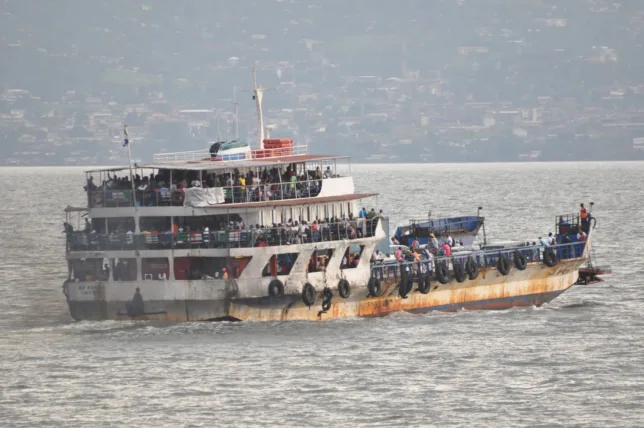 Als wir am Fähranleger ankommen, ist für afrikanische Verhältnisse wenig los. Wir kaufen ein billiges Ticket und warten. Neben uns liegt das verrostete Schwesterschiff auf Grund. Offensichtlich ist es am Pier abgesoffen. Erst als immer mehr Menschen kommen und dieses Wrack besteigen, merken wir, dass  das die intakte Fähre ist. Sie sieht nicht so aus. Wir fahren mit ein paar Autos und Lastwagen auf die Rampe und sind ganz hinten mit den Rädern gefangen zwischen Kisten und LKWs. Hier in der dunklen Ecke sitzen und liegen auch die Kushis. Sie schlafen oder sind trancehaft weggetreten. Ein junger Mann mit Goldkettchen entdeckt uns als Zuhörer. Er erzählt vom Bürgerkrieg und wie die Truppen der Warlords durch die Dörfer zogen und Gliedmaßen mit ihren Macheten abhackten und Frauen vergewaltigten. Wir wollen eigentlich gar nicht so viel wissen. Er hat aber eine Freude, den einzigen zwei Weißen weit und breit die Geschichte Sierra Leones nahe zu bringen. Seine Schilderungen sind detailliert und fürchterlich. Ich schätze sein Alter auf 30 Jahre und überlege mir, ob er aus eigener Erfahrung erzählt. Das kann eigentlich nicht sein, denn der zwölfjährige Krieg endete 2002. Aber vielleicht schätze ich ihn zu jung ein. Er nimmt uns unter seine Fittiche und weicht auch nicht von unserer Seite, als wir in der dunklen Ecke bei den Rädern bleiben, wo der Gestank der Dieselmotoren des Schiffs fast bewusstlos macht. Aus dem Augenwinkel beobachte ich, wie die Drogenkuriere Geldbündel in eine große Kiste legen und Plastikpakete rausnehmen und sich unters Shirt stecken. Die Räder mit den Packtaschen sind eingeklemmt. Wir können nicht weg hier und machen uns unsichtbar. Ein witziger Versuch – seit Wochen haben wir keine anderen Weißen getroffen. Wir sind hier so auffällig wie Zirkusclowns. Aber viele um uns herum sind high und in ihrem eigenen Film.